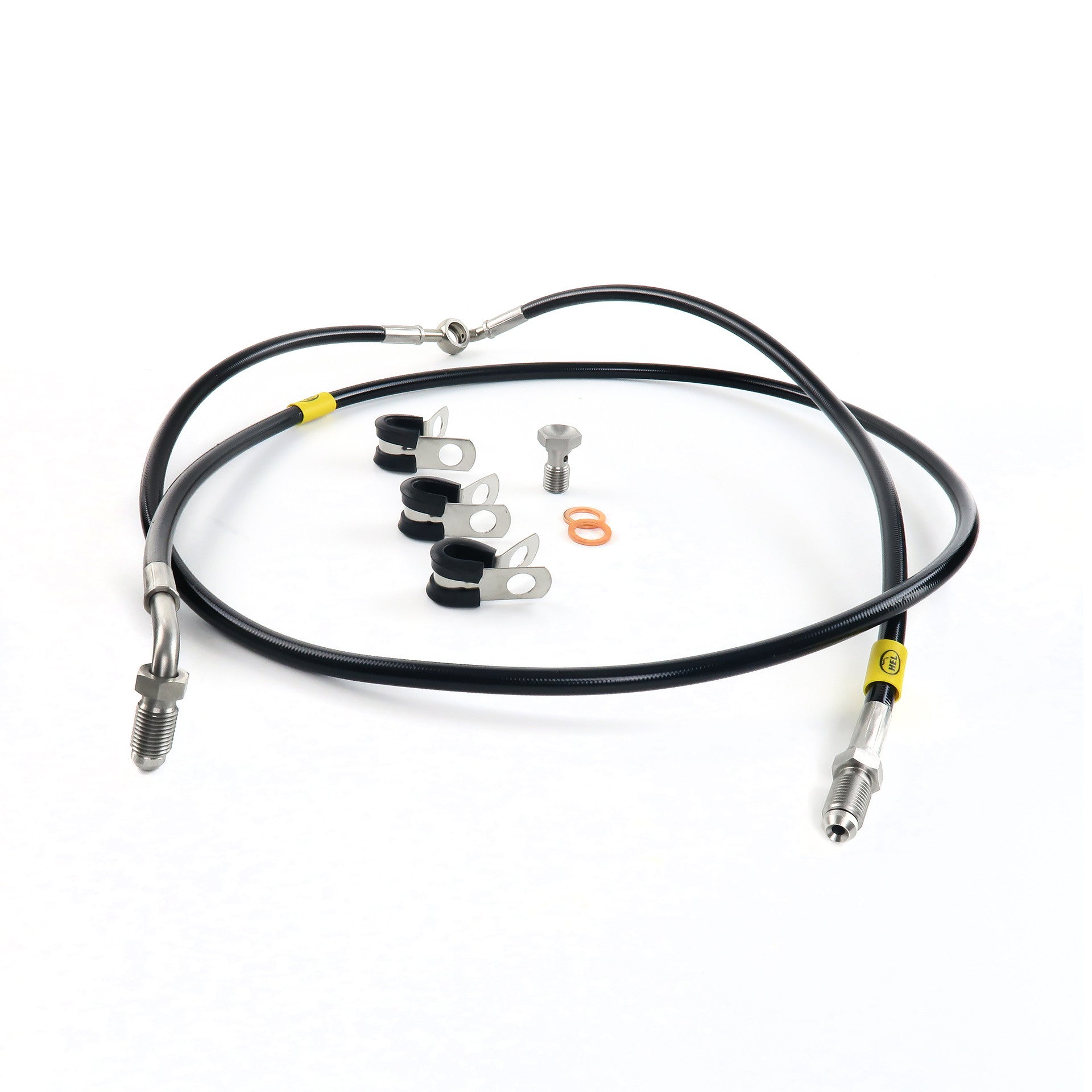 This kit replaces the hard line around the front subframe and up to the t-piece on the crossmember (early type) or to the PDWA valve (late type). Comes complete with stainless steel banjo bolt, copper crush washers and three p-clips for mounting on the subframe.