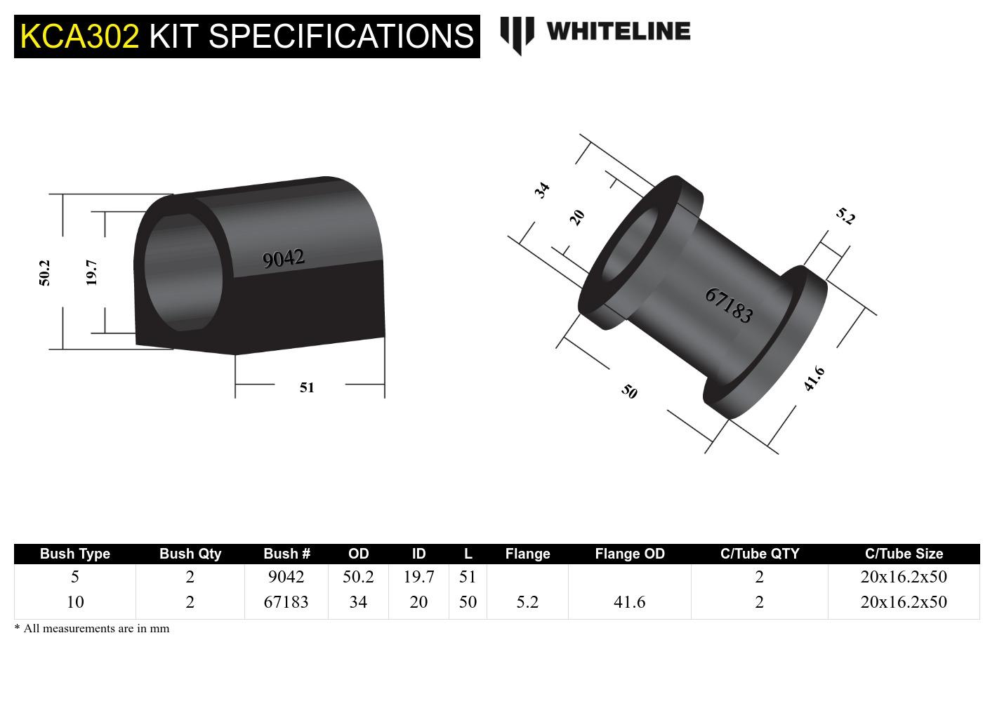 Whiteline caster kits are designed to improve cornering grip and vehicle straight line stability. This kit is supplied with dual offset bushings to give greater steering feel, more steering weight, greater precision all through increased static caster and dynamic negative camber gain. In addition, Whiteline bushings provide improved braking performance, and less under load alignment change. Whiteline caster kits are designed to improve cornering grip and vehicle straight line stability through increased static caster and dynamic negative camber gain. In addition, synthetic elastomer bushings provide improved steering feedback and braking performance. *All prices shown on the Whiteline website include GST. You will not be charged any additional fees related to tax.