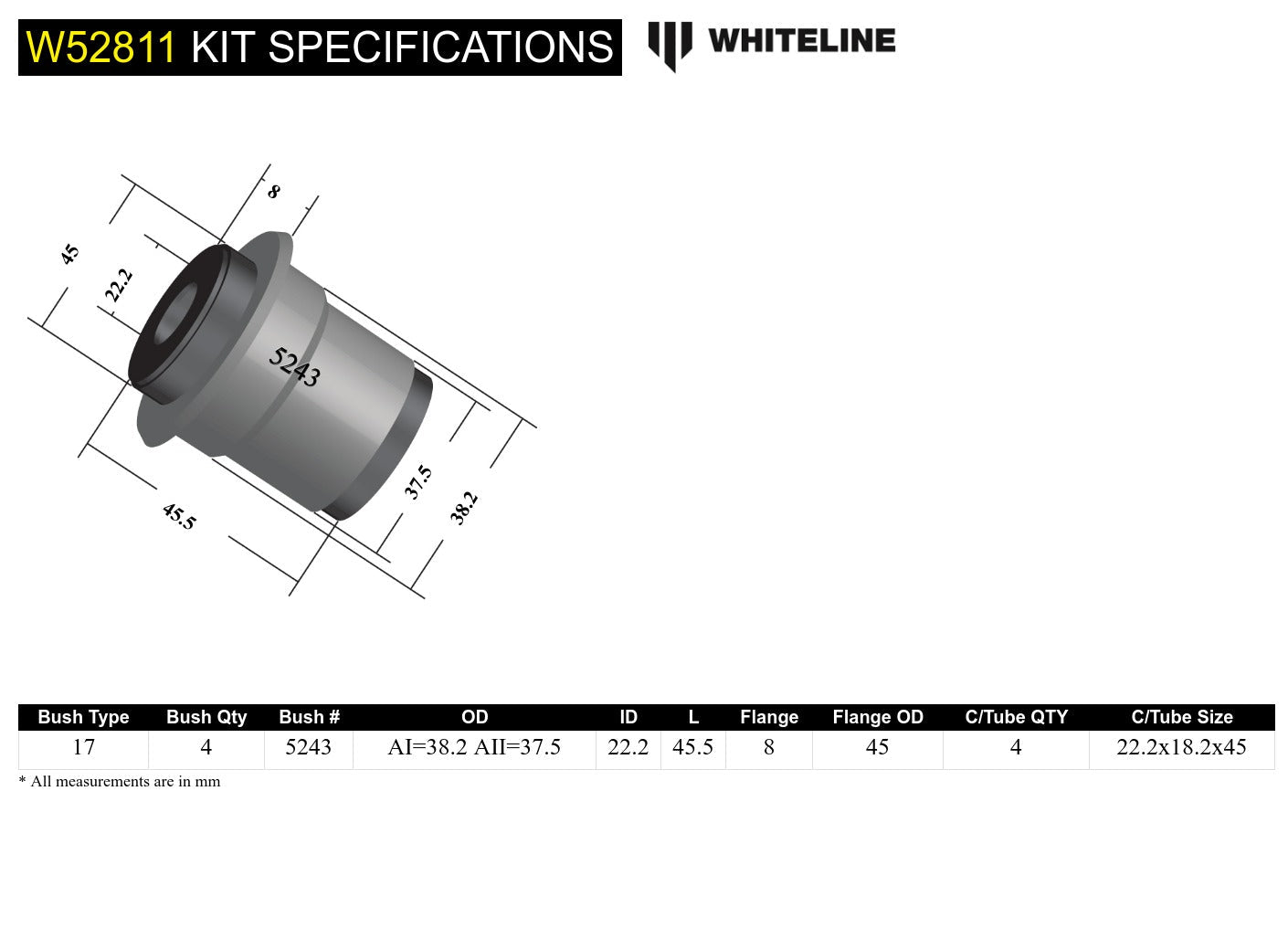 Worn front control arm bushings have a huge influence on vehicle stability, steering precision and braking efficiency. Replace worn bushings to as new condition utilising Whiteline's advanced synthetic elastomer bushings with core characteristics ensuring superior elasticity, memory and outright durability for all forms of driving applications. Worn front control arm bushings have a huge influence on vehicle stability, steering precision and braking efficiency. Replace worn bushings to as new condition utilising Whiteline's advanced synthetic elastomer bushings with core characteristics ensuring superior elasticity, memory and outright durability for all forms of driving applications. *All prices shown on the Whiteline website include GST. You will not be charged any additional fees related to tax.