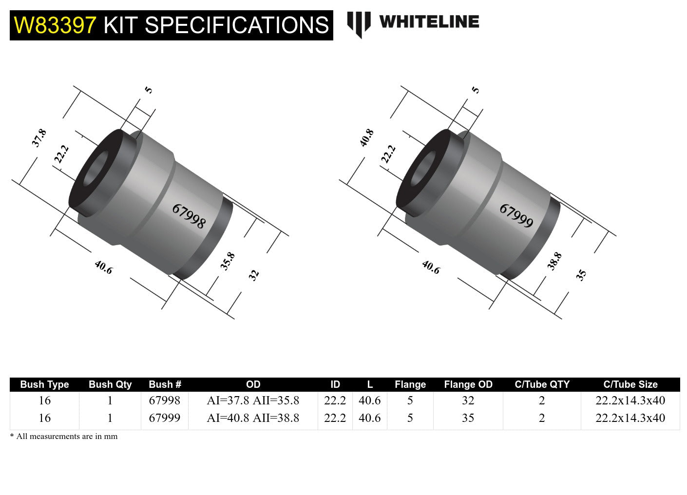 Eliminate wheel shimmy and ensure accurate axle location with Whiteline synthetic elastomer with core characteristics ensuring superior elasticity, memory and outright durability for all forms of driving applications. Eliminate front end squirm and ensure accurate axle location with Whiteline synthetic elastomer with core characteristics ensuring superior elasticity, memory and outright durability for all forms of driving applications. *All prices shown on the Whiteline website include GST. You will not be charged any additional fees related to tax.