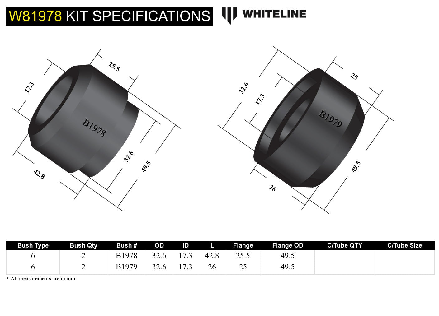 Not many know but worn suspension bushings have an effect on braking performance. In particular these bushings tend to absorb most of the loads under braking resulting in severe wear and reduced braking efficiency over time. Replace these worn parts with Whiteline synthetic elastomer bushings that offer long lasting durability for a safer more predictable vehicle. Not many know but worn suspension bushings have an effect on braking performance. In particular these bushings tend to absorb most of the loads under braking resulting in severe wear and reduced braking efficiency over time. Replace these worn parts with Whiteline synthetic elastomer bushings that offer long lasting durability for a safer more predictable vehicle. *All prices shown on the Whiteline website include GST. You will not be charged any additional fees related to tax.