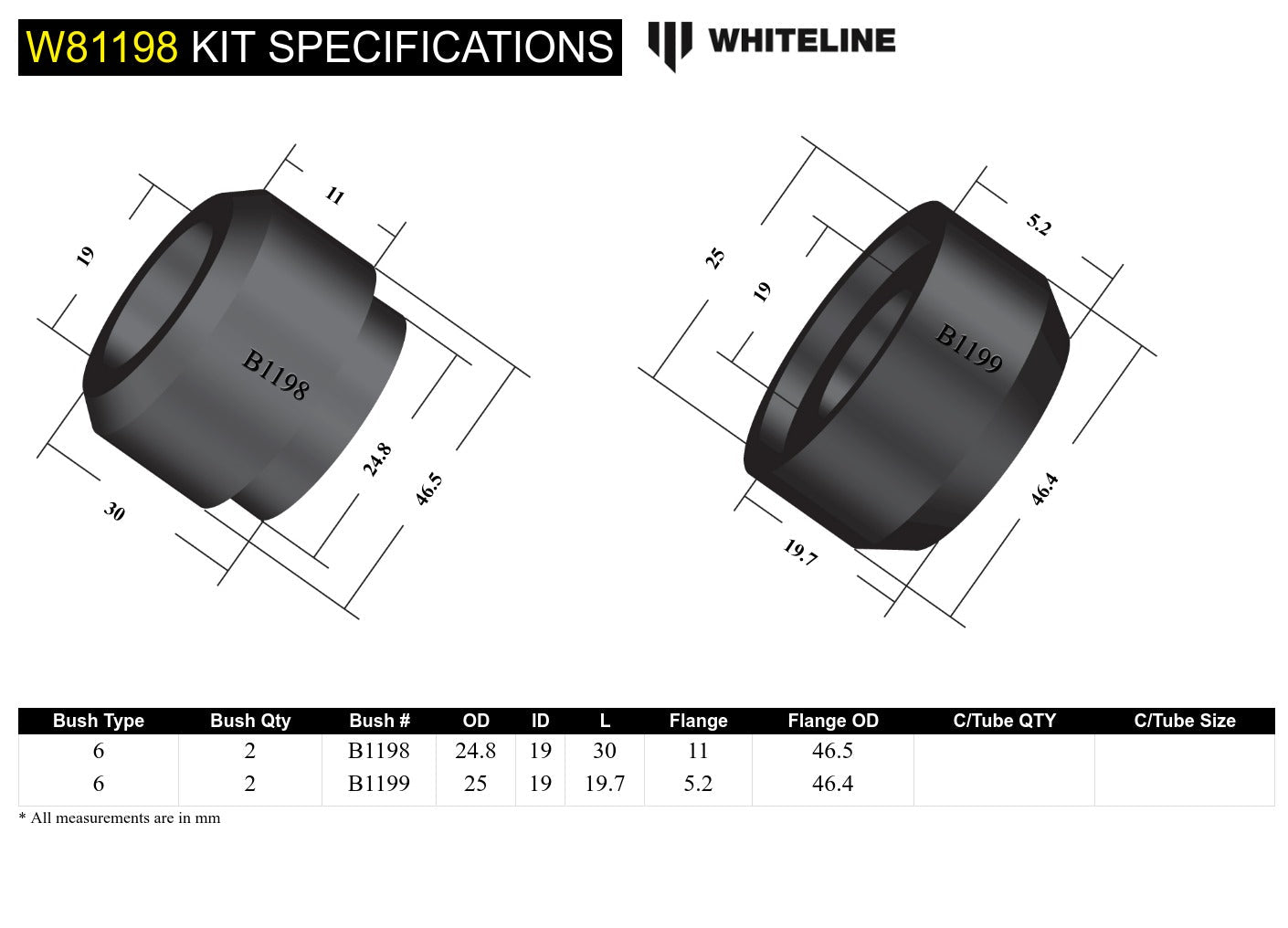 Not many know but worn suspension bushings have an effect on braking performance. In particular these bushings tend to absorb most of the loads under braking resulting in severe wear and reduced braking efficiency over time. Replace these worn parts with Whiteline synthetic elastomer bushings that offer long lasting durability for a safer more predictable vehicle. Not many know but worn suspension bushings have an effect on braking performance. In particular these bushings tend to absorb most of the loads under braking resulting in severe wear and reduced braking efficiency over time. Replace these worn parts with Whiteline synthetic elastomer bushings that offer long lasting durability for a safer more predictable vehicle. *All prices shown on the Whiteline website include GST. You will not be charged any additional fees related to tax.