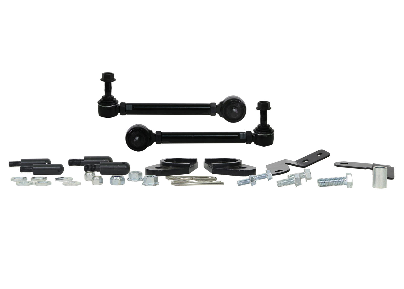 Kit Contents: 2 Links, 2 Plates, 2 Brackets, 6 Disconnect Pins, 2 R-Clips, 1 Tube, 5 Bolts, 6 Washers, 7 Nuts
